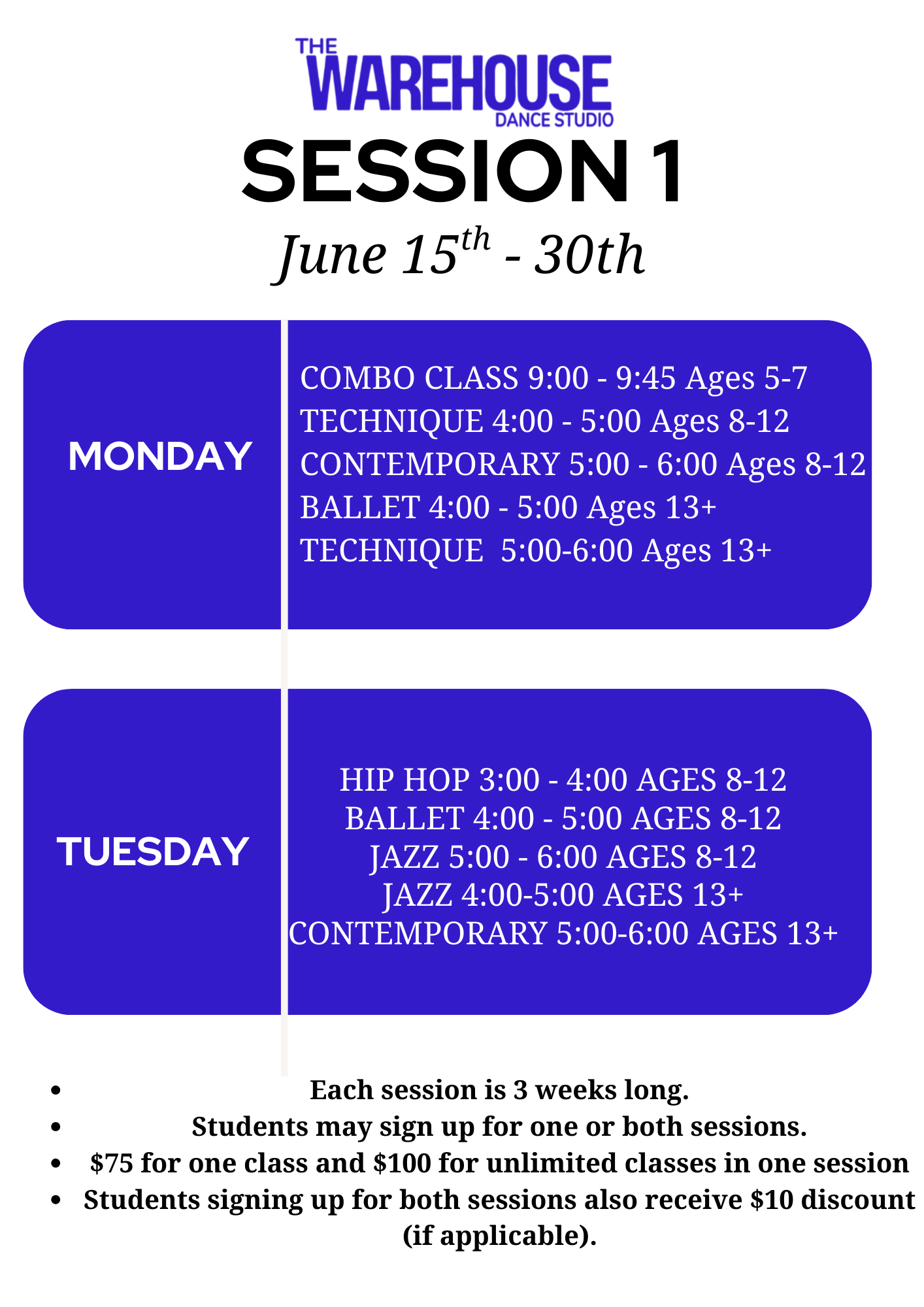 Students signing up for both sessions will also receive $10 discount (if applicable).